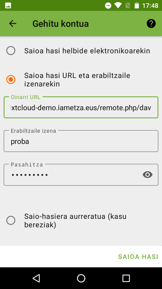Kontua gehitzeko hiru aukera daude. Saioa hasi URL eta erabiltzaile izenarekin jartzen duena erabiliko dugu.