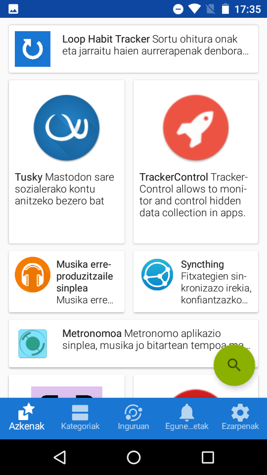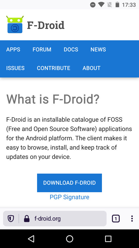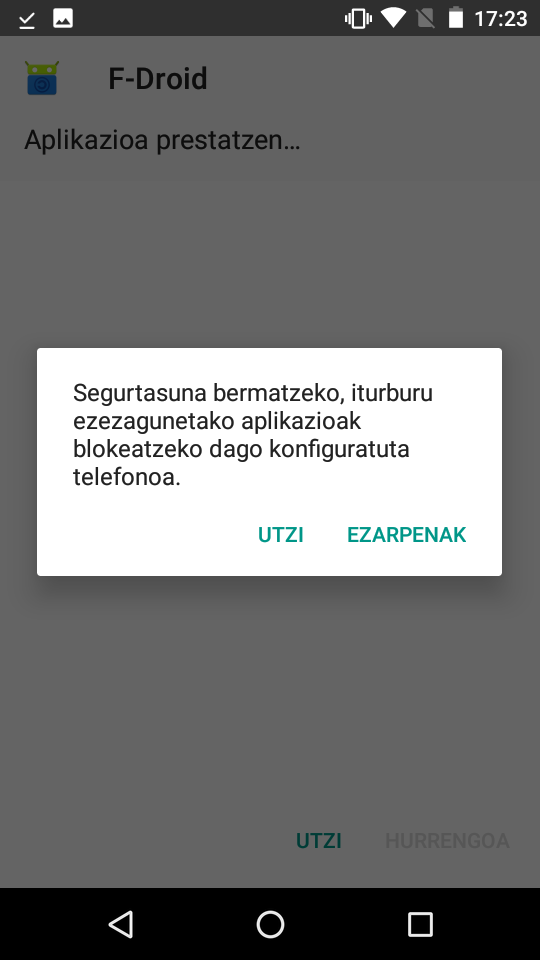 Software libreko aplikazioen F-droid biltegitik instalatzea (doan). Kasu honetan, F-droid aplikazioa dagoeneko ez badaukazu, instalatu beharko dugu. Googlek ez ditu software biltegi alternatiboak onartzen Google Playn, horregatik F-droid-en webgunetik instalatu behar dugu.
