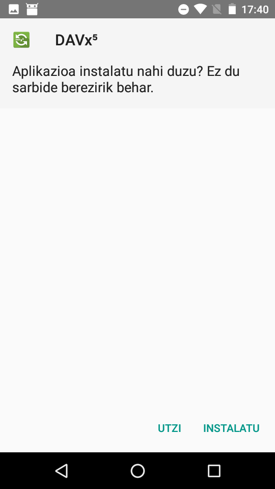 DAVx⁵ aplikazioa instalatu nahi al dugun galdetuko digu. Instalatu botoia sakatuko dugu.