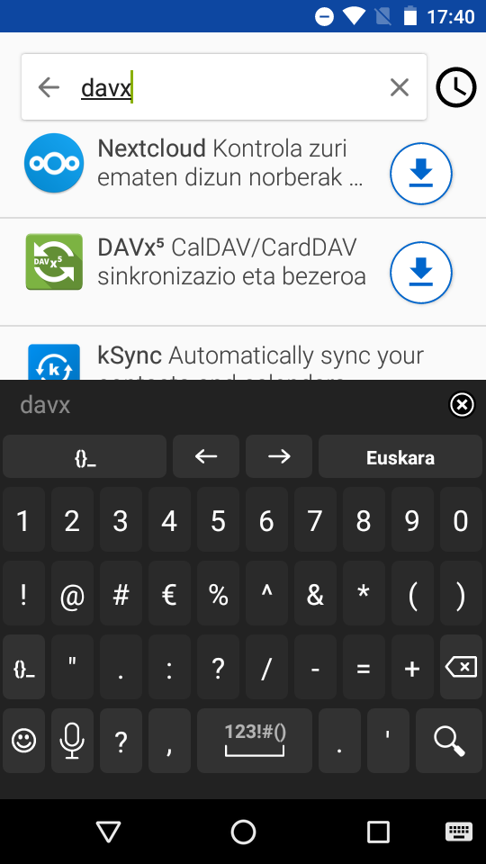 DAVx⁵ CalDAV/CardDAV sinkronizazio eta bezeroa jartzen duena da behar duguna. Bere gezian klik egingo dugu, aplikazioa gure gailura deskargatzeko.