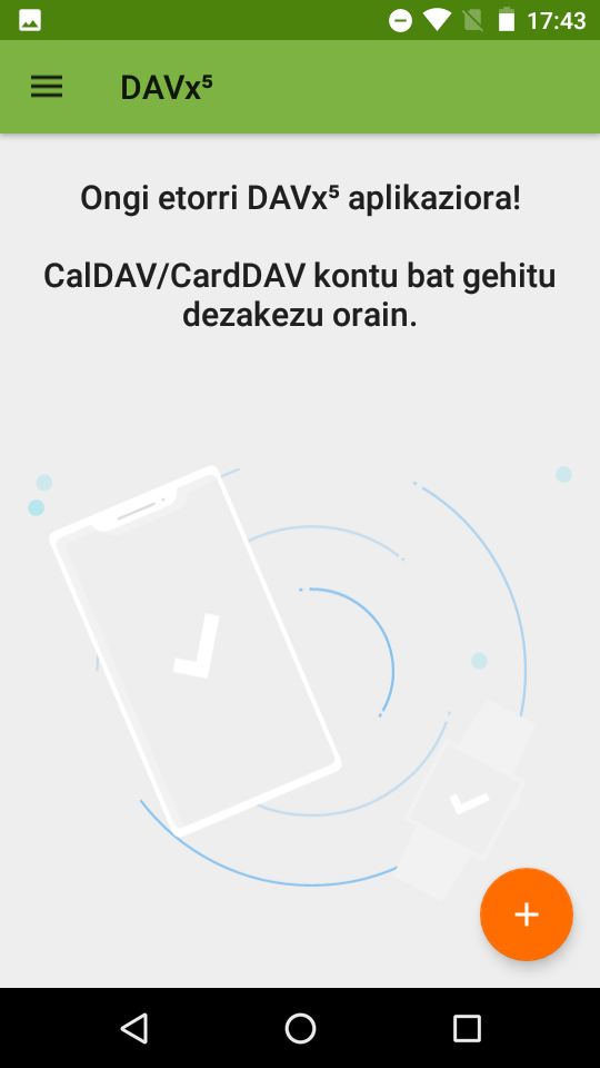 ✓ ikurra sakatu ondoren DAVx⁵ aplikaziora ongi etorria ematen digun orri bat agertuko zaigu. Behean eskuinean dagoen plus botoian klik egingo dugu kontu bat gehitzeko.