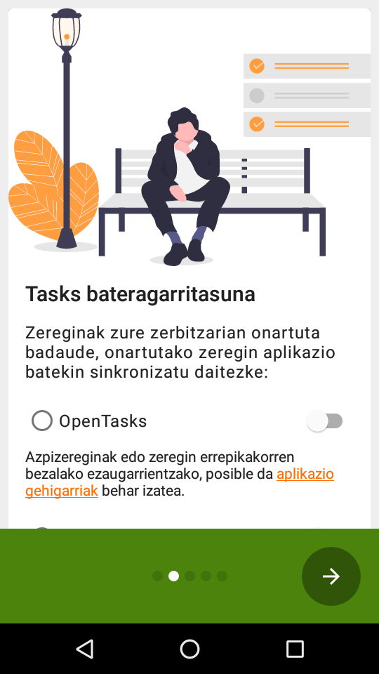 Hurrengo pantailan Nextcloudeko Zereginak (Tasks) aplikazioa Androidek OpenTasks aplikazioarekin sinkronizatu nahi dugun galdetuko digu.
