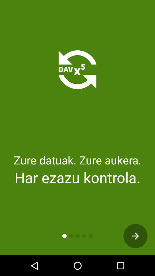 DAVx⁵ aplikazioa instalatu ondoren, ireki egingo dugu. Ongi etorri pantaila bat agertuko zaigu. Behean eskuinean dagoen gezia sakatuko dugu aurrera jarraitzeko.