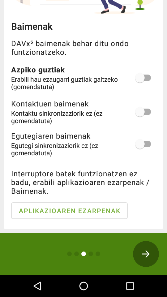 Hurrengo pantailan DAVx⁵ aplikazioari ze baimen eman nahi dizkiogun aukeratu beharko dugu.
