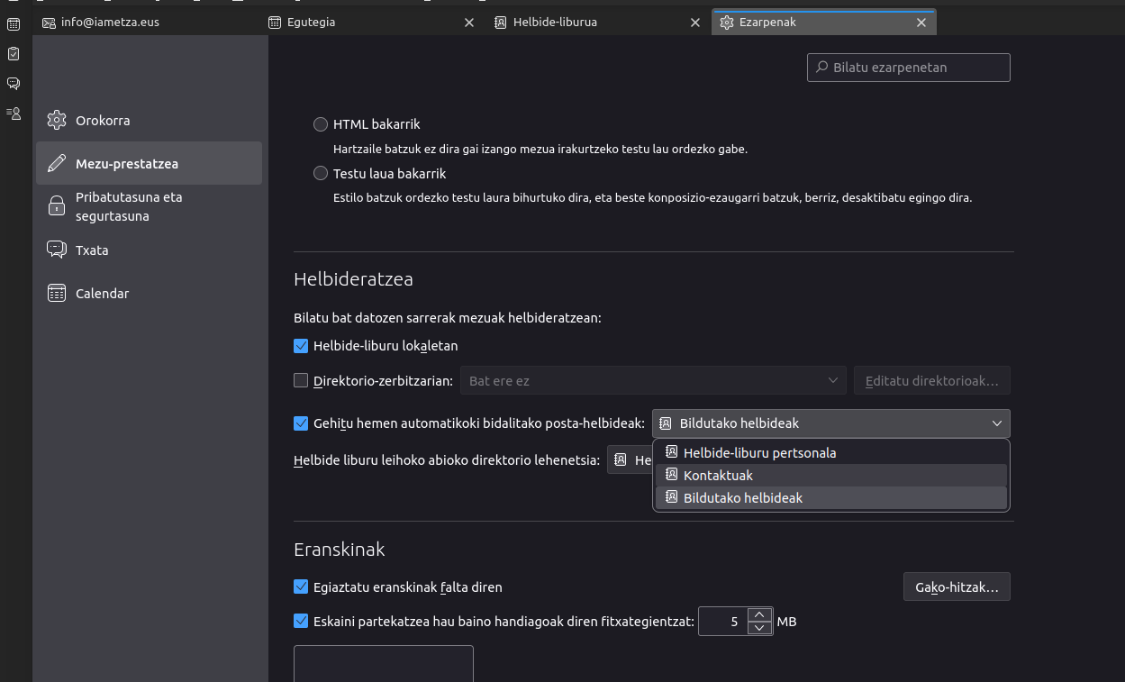 "Mezu-prestatzea" barneko "Helbideratzea" atalean dagoen "Gehitu hemen automatikoki bidalitako posta-helbideak:" aukeran gure Nextcloud instantziako helbide-liburua aukeratuko dugu.