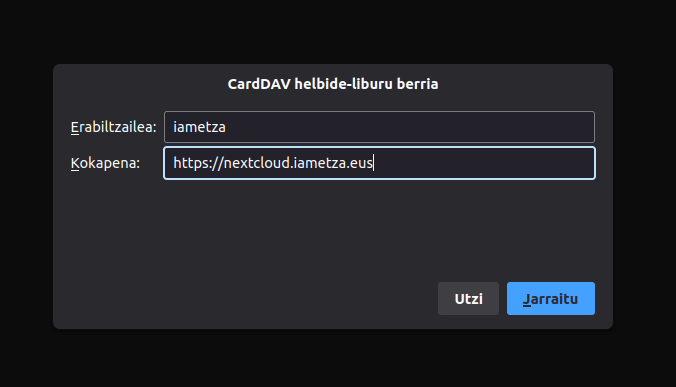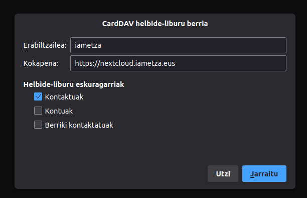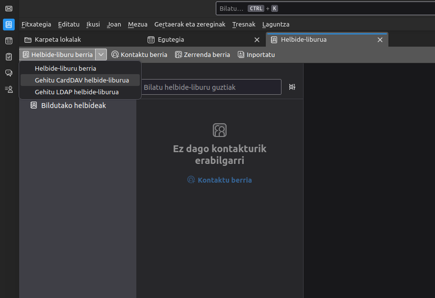 Thunderbirdeko kontaktuen atalean helbide-liburu berria gehitzeko prozesua martxan jarri. Helbide-liburu berria aukeren hartean Gehitu CardDAV helbide-liburua aukera hartuko dugu.
