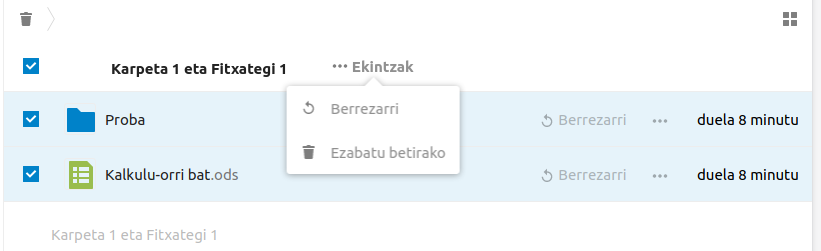Zakarrontziko fitxategi eta karpetak multzoka berrezarri edo betirako ezabatu ditzakegu. Horretarako, errenkaden hasierako kontrol-laukiak erabiliz hautatu eta Ekintzak botoian klik egin behar da. Bi aukera daude: Berrezarri eta Ezabatu betiko.