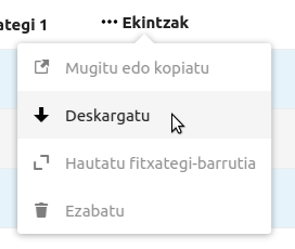 Egin klik ยทยทยท Ekintzak botoian. Laster-leihoan agertuko zaizkigun aukerek hautatutako fitxategi eta karpeta guztiei eragiten diete. Deskargatu jartzen duen aukeran klik egitean hautatutako fitxategi eta karpetak zip artxibo konprimatu batean deskargatuko ditugu.