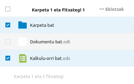Deskargatu nahi ditugun fitxategi eta karpeten errenkaden hasierako kontrol-laukiak hautatuko ditugu. Adibidez, irudian Karpeta bat izeneko karpeta eta Kalkulu-orri bat izeneko fitxategia daude hautatuta.
