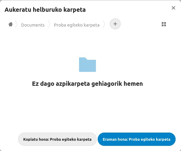 Helburuko karpeta aukeratuko dugu. Adibidez, irudian Documents karpetaren barruan dagoen Proba egiteko karpeta karpeta hautatu dugu. Barruan karpeta gehiago ez daudenez, Ez dago azpikarpeta gehiagorik hemen mezua agertzen zaigu.