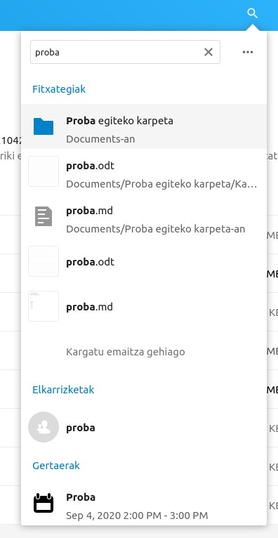 Bilatu nahi dena idatzi eta Enter tekla sakatu. Bilaketa fitxategi eta karpeten izenetan egiten du, baina baita Nextcloud-eko beste aplikazioetan ere. Adibidez, irudian ikusten den bezala Elkarrizketa eta Gertaeretan ere.