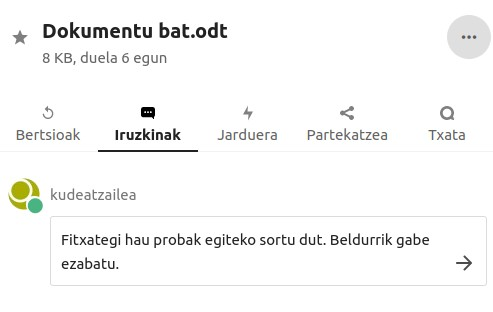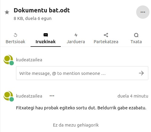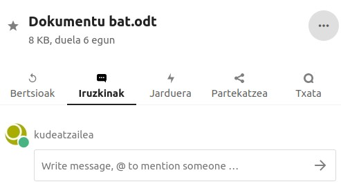 Nahi izanez gero fitxategi edo karpeta bati buruzko iruzkinak utzi daitezke, Nextcloudeko beste erabiltzaileekin lanak koordinatu edo norbere buruari oharrak uzteko.