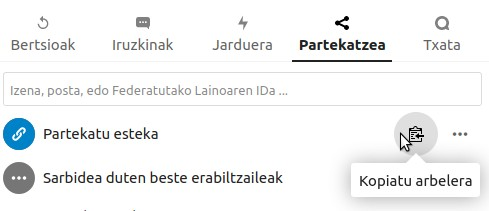 Partekatzeko esteka berriz kopiatu nahiko bagenu, nahiko da Kopiatu arbelera botoian klik egitea (fitxategi edo karpeta bat partekatzeko plus botoia sakatu eta esteka sortu ondoren bakarrik agertzen da).