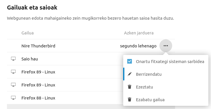 Noizbait token hau baliogabetu nahi izanez gero Nextcloudeko Ezarpenak > Pertsonala > Segurtasuna fitxako Gailuak eta saioak atalean aurkitu eta bere errenkadako hiru puntuen botoian klik egin eta Ezabatu gailua aukeran klik egingo dugu Thunderbird-i baimena kentzeko edo Ezeztatu tokena ezabatzeko.