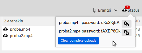 Use generated passwords: Fitxategi bakoitzarentzat ausazko pasahitz bat sortuko da. Pasahitza(k) ikusi eta kopiatzeko egin klik Thunderbird-eko Eranskinak atalaren gaineko *cloud status botoia. Pasahitz hau(ek) mezua jasoko duenari bidali behar di(zki)ozu.
