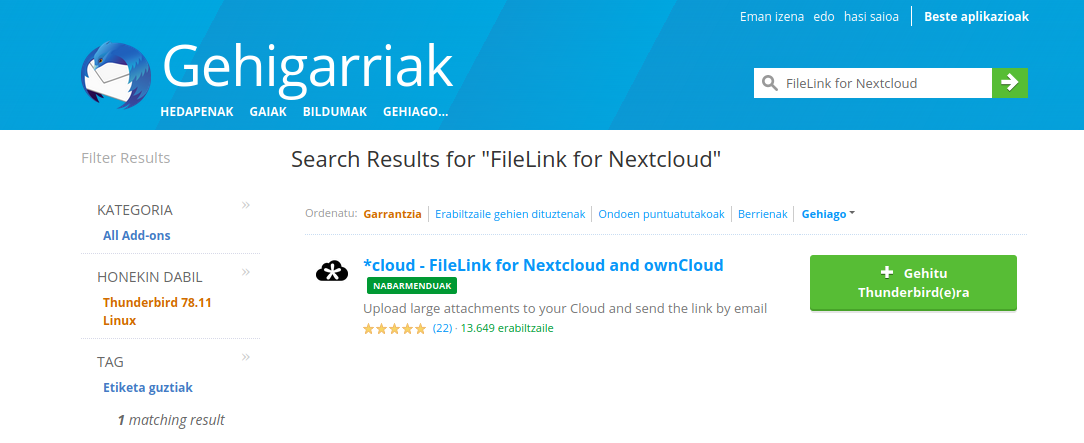 Thunderbird-en gehigarriak instalatzeko orria agertuko zaigu. Bilatzailean "FileLink for Nextcloud" bilatu eta sakatu Gehitu Thunderbird(e)ra botoia *cloud - FileLink for Nextcloud and ownCloud gehigarria instalatzeko.