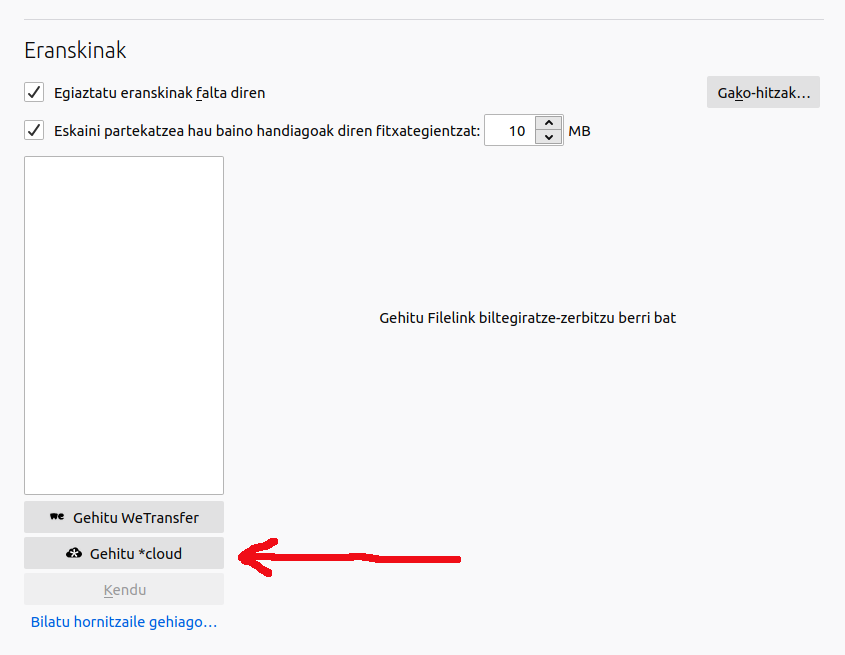 Gehigarrien fitxa itxi eta berriz ere Hobespenak > Mezu-prestatzea fitxako Eranskinak atalera joango gara. Bertan *Gehitu cloud botoi berri bat agertu zaigula ikusiko dugu. Sakatu egingo dugu.