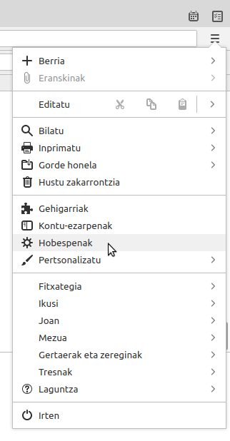Ireki Thunderbird-en menua eta egin klik Hobespenak aukeran.