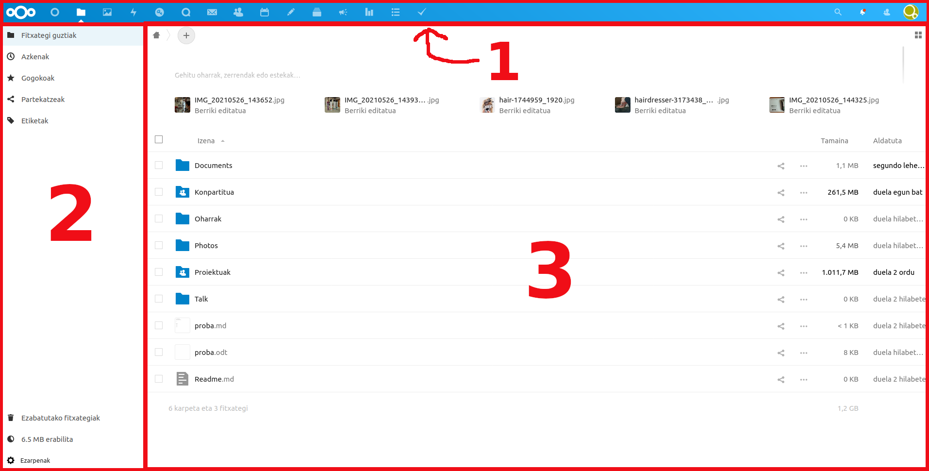 Bilaketa: Fitxategi, karpeta eta Nextcloudeko aplikazioetan (egutegiak, oharrak...) bilaketak egiteko aukera ematen du.